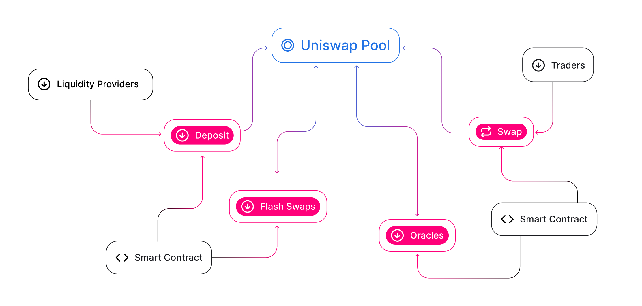 The Uniswap ecosystem is primarily comprised of three types of users: liquidity providers, traders, and developers. Liquidity providers are incentivized to contribute ERC-20 tokens to common liquidity pools. Traders can swap these tokens for one another for a fixed 0.30% fee (which goes to liquidity providers). Developers can integrate directly with Uniswap smart contracts to power new and exciting interactions with tokens, trading interfaces, retail experiences, and more.